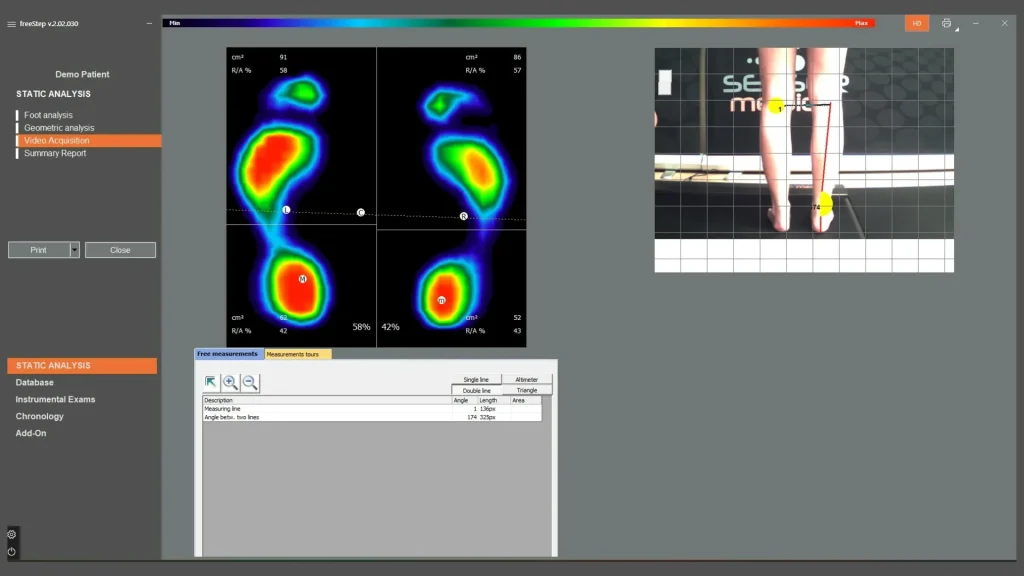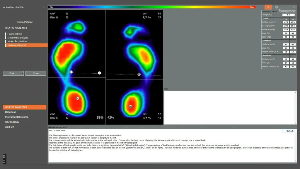 Vizualizacija otiska za analizu raspodele pritiska, raspodele opterećenja, kontaktne površine, centra pritiska za svaku podršku i centra telesnog pritiska.